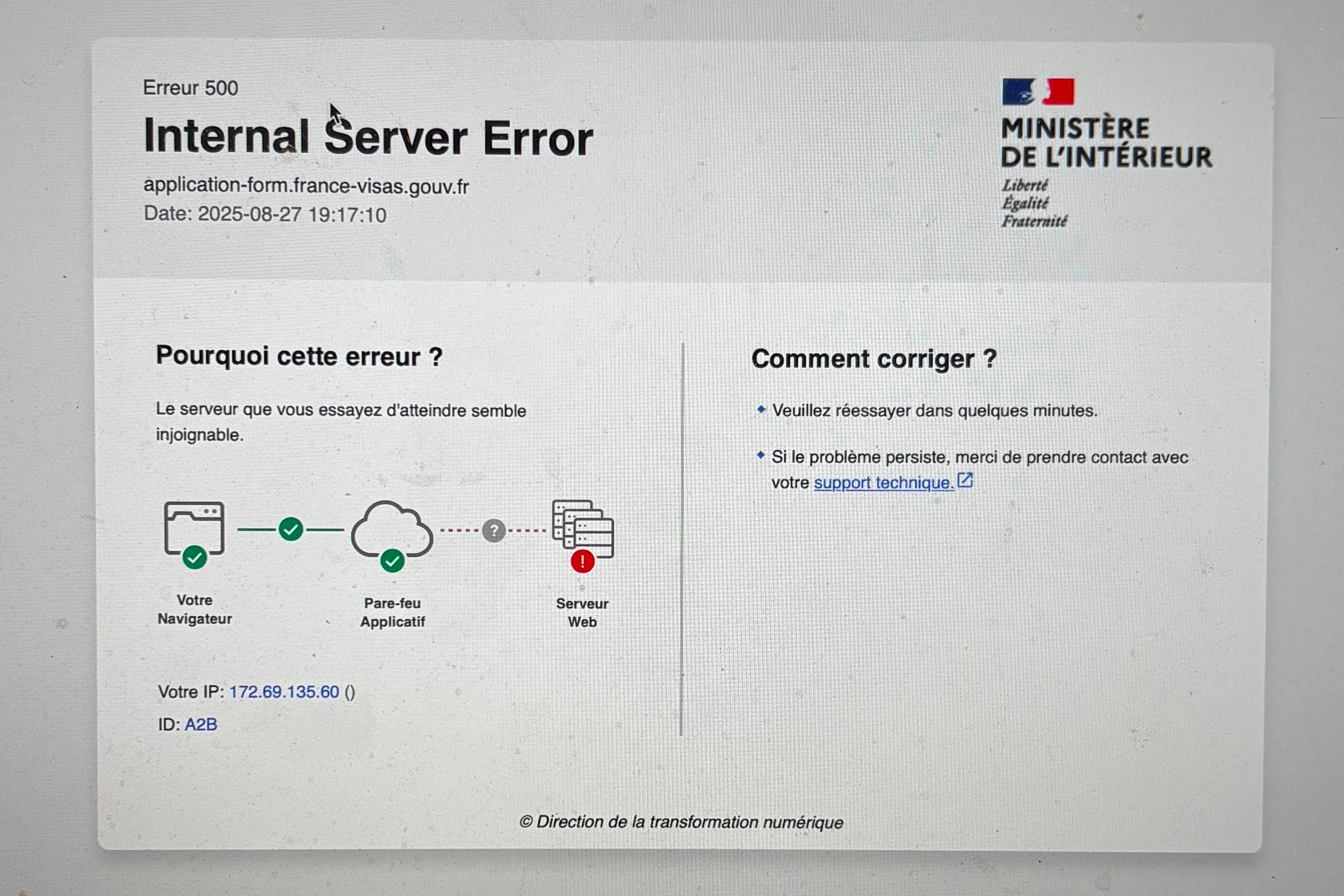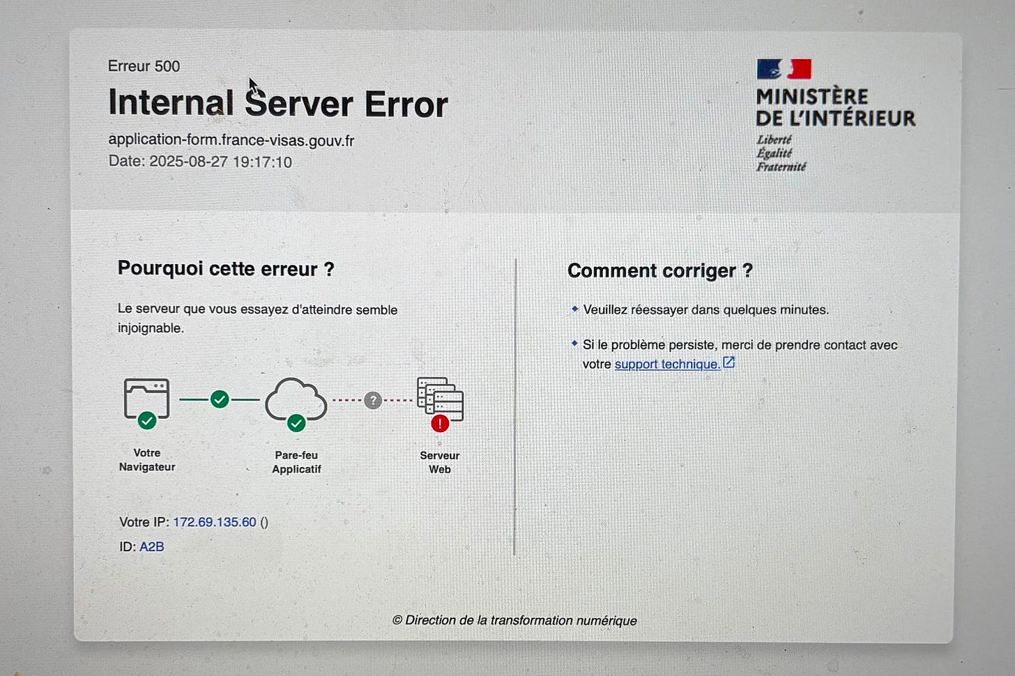 francevisas.gouv.fr is down everywhere. Not only did I get screwed, but so did everyone else in this place (including TLS), and everyone in every French Visa office accross the globe. Chaos is about to spill into the anxiety pool. Unless, that is, French IT can really lock in.